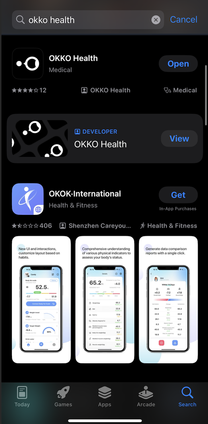 2. Procure a aplicação OKKO Health. Se houver uma atualização disponível*, aparecerá o botão "ATUALIZAR".